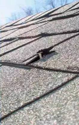 如果瀝青瓦沒有固定好,風(fēng)可以從下方把瀝青瓦吹起來,這樣水就很容易進(jìn)入屋面。釘釘子偷懶的例子很多,包括少用了釘子、釘子在瀝青瓦上的位置過高或者過低,以及不按照抗風(fēng)的釘連接要求(風(fēng)荷載高的地區(qū)每片瀝青瓦上用六顆釘子)施工等。所有時(shí)候都要遵守瀝青瓦包裝上的用釘指導(dǎo),所有風(fēng)荷載高的地區(qū)以及屋面坡度超過10/12情況下,瀝青瓦安裝都要遵循抗風(fēng)的釘連接要求。