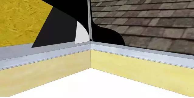 很多施工人員使用整條的金屬泛水板或防水卷材安裝在墻體與屋面的交接位置,但這會(huì)使從瓦片邊緣流入下方的水再無法被帶回到瓦片上方。這就大大增加了漏水的可能性,而階梯式泛水板是解決該問題的最佳選項(xiàng),且其安裝過程并不會(huì)過于繁瑣。標(biāo)準(zhǔn)瀝青瓦上的階梯式泛水板長(zhǎng)度約180mm,公制瀝青瓦上的階梯式泛水板長(zhǎng)度約200mm。