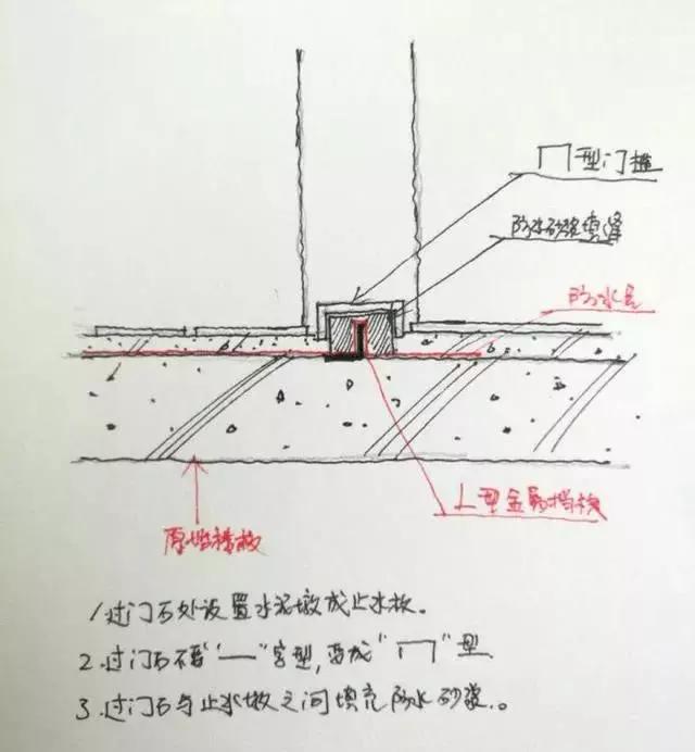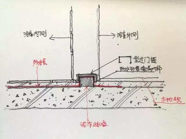 解決的方法,就是在門檻下設一止水墩,原理雖與防水層多突出一點是同樣道理,但是止水墩的高度,要超過木地板,并且采用“ㄇ”型門檻,在門檻內填滿防水泥漿,如此可增加斷水長度,擋住虹吸效應。