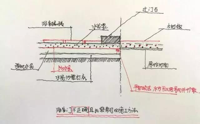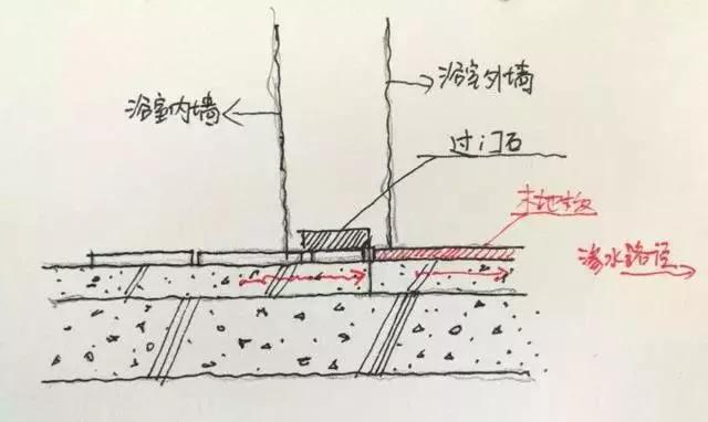 上圖中的紅色箭頭標注的地方,這些都是師傅在裝修中忘記做的,如果師傅們沒有做突起的話,這樣的話,衛(wèi)生間要是有水的話就會直接從浴室通到臥室的地板上,從而導致地板被泡!